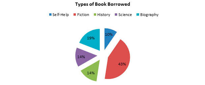 Moving on to the types of books borrowed, fiction was in demand the most, at 43%. The next most popular books were biographies, accounting for around a fifth of the total. The borrowing of science and history were identical, at 14% each, leaving self-help as the least popular at 10%.