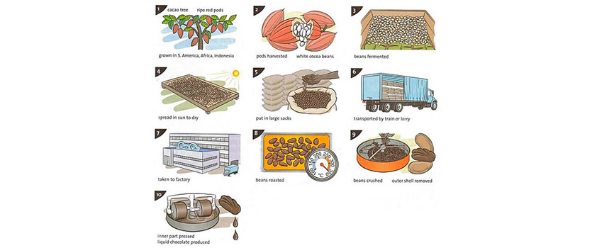 The diagram explains the process for the making of chocolate. There are a total of ten stages in the process, beginning with the growing of the pods on the cacao trees and culminating in the production of the chocolate.