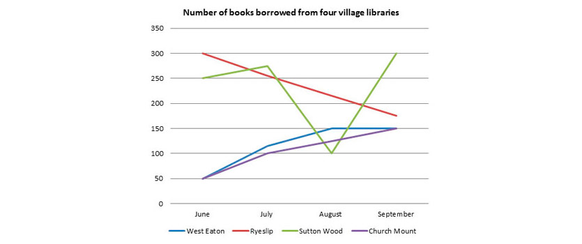 The line graph shows the number of books that were borrowed in four different months in 2014 from four village libraries, and the pie chart shows the percentage of books, by type, that were borrowed over this time.