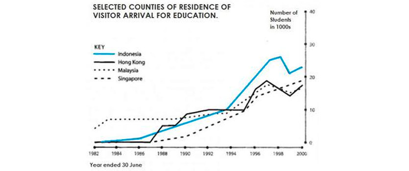 At the start of the period, while Malaysia had around 5,000 students per year visiting Australia, the other countries had none. However, though remaining at the highest number up until 1990 and increasing after this, visitors number from Malaysia finished at the lowest levels of all the countries, at around 18,000.
