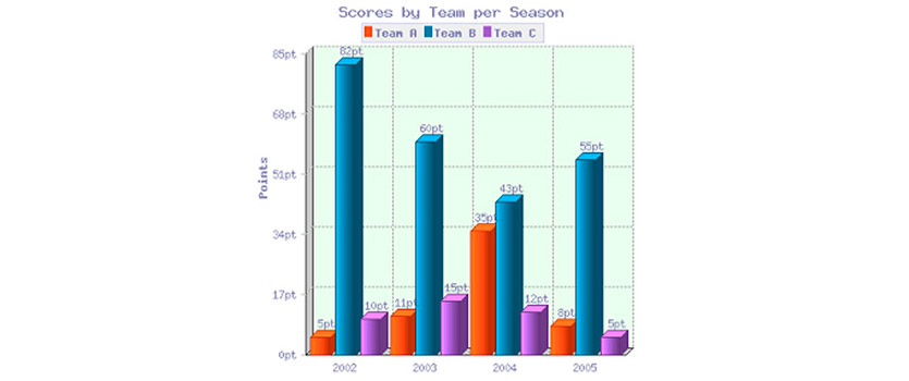 In 2002, the score of team B far exceeded that of the other two teams, standing at 82 points compared to only 10 for team C and a very low 5 for team A. Over the next two years, the points for team B decreased quite considerably, dropping by around half to 43 by 2004, but they still remained above the points for the other teams.